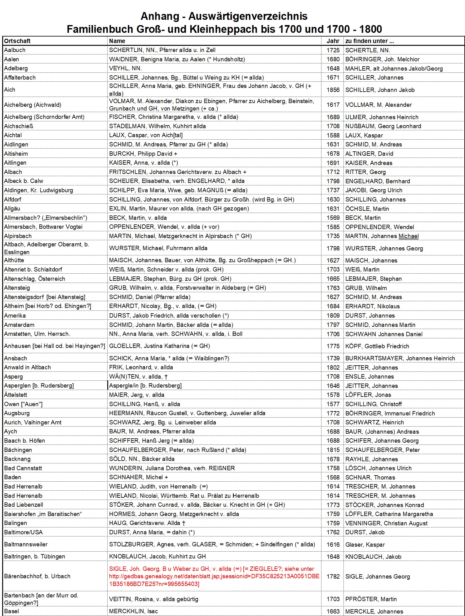 2. Nach Ortschaften sortiert. Dies bietet sich an, wenn jemand wissen möchte welche Personen von Großheppach kamen, nach dort zogen oder dort eine Zeitlang lebten. Oder dort auch lediglich die Hochzeit stattfand.